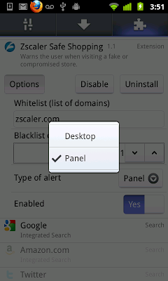 Version 1.1 of Zscaler Safe Shopping offers the same features as version 1.0 for Desktop browsers. However, the notification system on the mobile version is a slightly different. Extension developers can use either the built-in alert system, or display a dialog box to the user. The former system is less intrusive, but it seems that the implementation is different depending on the OS. Firefox 4 Mobile on Windows displays a nice panel at the botttom of the phone, while my Android phone shows a tiny message at the top of the phone. On my phone, the warning is barely noticeable, and does not work when the browser is in full-screen.