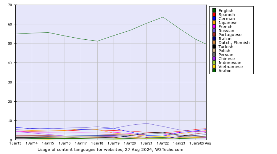 Over the past few years, there has been a shift in the language availability of online content. Every year, we see more content emerging in a wider variety of languages, and this trend shows no signs of slowing. As figure 1 highlights, English has long been the dominant language online. However, that lead is gradually shrinking as content in other languages gains momentum and popularity.