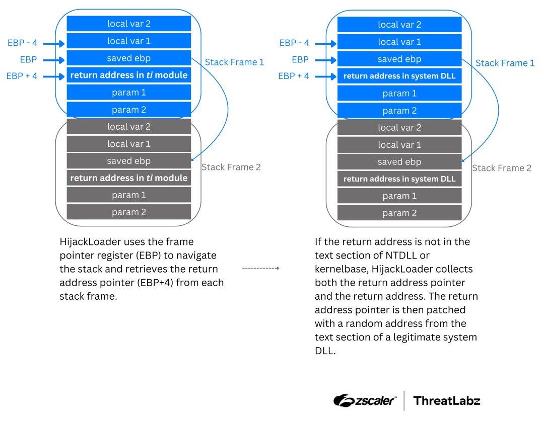 HijackLoader uses the base pointer register (EBP) to navigate the stack by following the chain of EBP pointers. The malware retrieves the return address pointer (EBP+4) from the stack frames. If the return address is not located in the text section of NTDLL or kernelbase, HijackLoader collects both the return address pointer and the return address of the stack frame. The return address pointer is then patched with a random address from the text section of a legitimate system DLL. This activity is repeated until the stack limit is reached or when three adjacent stack frames have the return address in the text section of NTDLL or kernelbase. The process is illustrated in the diagram below: