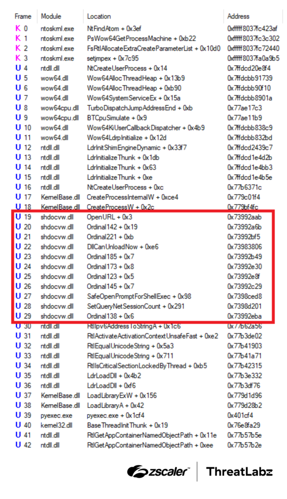 Figure 3: Example of HijackLoader spoofing the call stack with the fake frames enclosed in a red square.