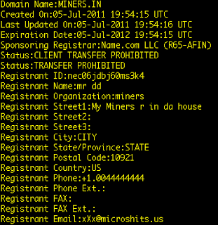 Obvious fake domain registration information provided to Name.com for registration of the miners.in domain:
