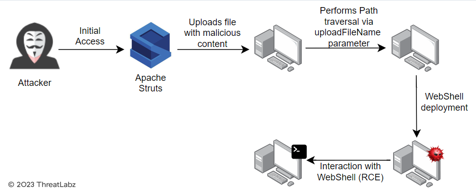 The attacker accesses a vulnerable version of Apache Struts to send an HTTP POST request to upload a malicious file.
