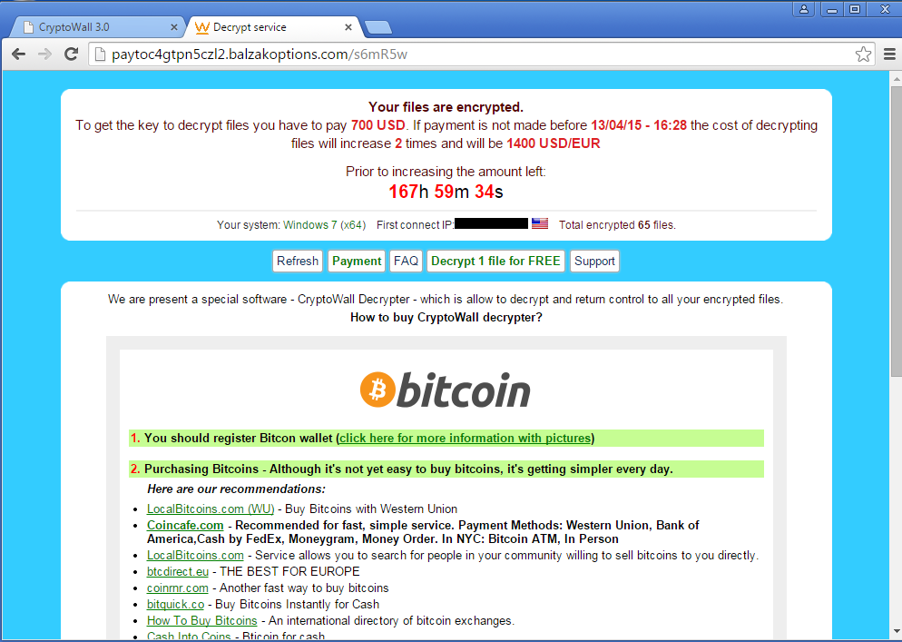 Once infected, CryptoWall 3.0 puts the victim on an extortion countdown. The ransom amount doubles at each threshold set by the attacker. The attacker's preferred currency is in Bitcoin, but the victim is offered numerous methods of payment.