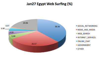 ImageThe above chart illustrates the Egyptian Internet usage during the protests and leading up to their Internet shutdown. Social media and news related web pages accounted for roughly 65% of the web browsing that was done from Egyptian client IPs through our cloud.