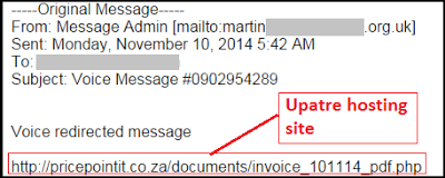 We have seen an increase in the number of Upatre Downloader infections occurring through spammed messages containing fake invoices or voice-mail messages in the past month. The final payload being downloaded from these recent Upatre infections tends to be the Dyreza Banking Trojan. Below is a sample e-mail message from this campaign: