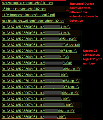 Here is a sample list of HTTP requests that will provide a good indication of an Upatre and Dyreza compromise on your network:
