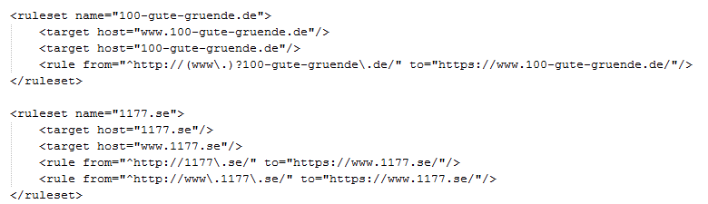 The HTTPS Everywhere rules define which domain name can be accessed over HTTPS and how URLs need to be translated. For example, http://www.google.com/ should be translated into https://encrypted.google.com/. Some sections of websites may not be available over HTTPS and the rules take care of these exceptions.