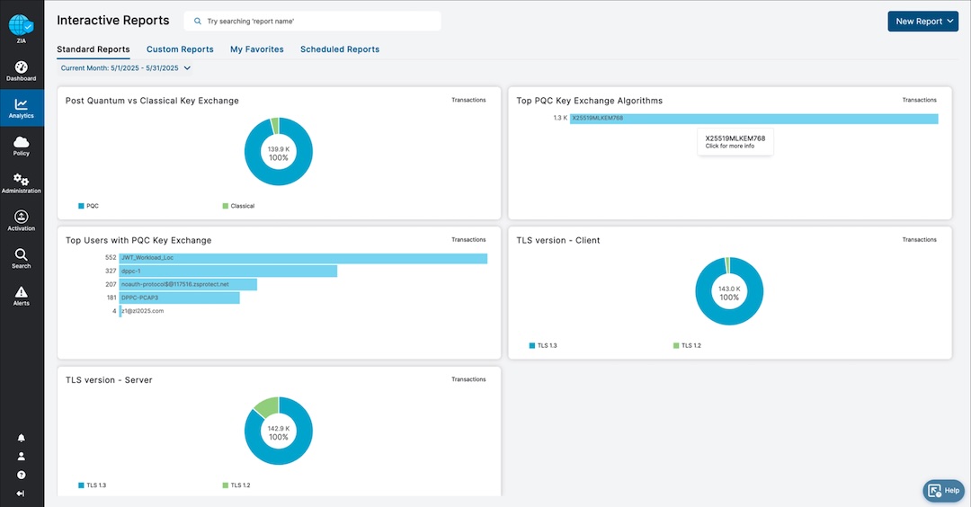 Today, we’re excited to launch interactive reporting that provides visibility into post-quantum ciphers. This interactive report available in the Zscaler Admin Portal provides details on top PQC key exchange algorithms as well as PQC vs. classical key exchange used across the 500 billion transactions the Zero Trust Exchange processes daily: