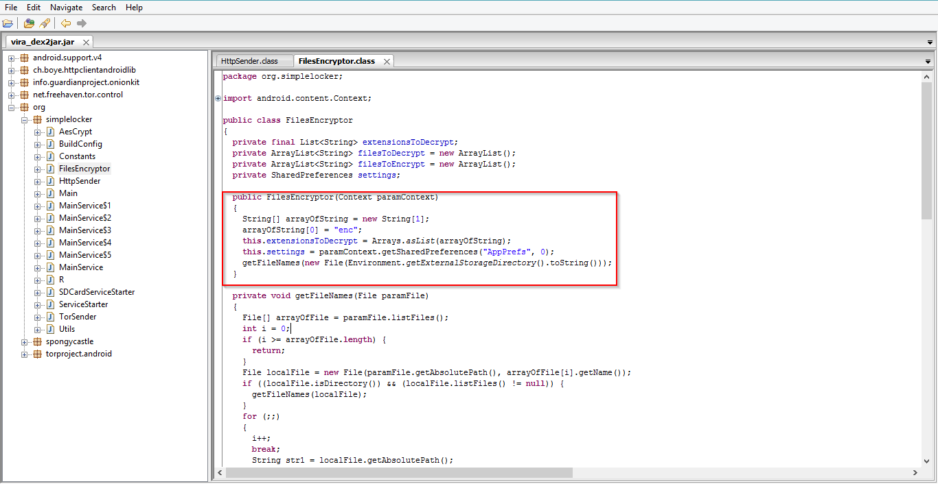 The above screenshot shows how ransomware is using AES encryption for encrypting files. Simplocker will scan for the filetypes jpeg, jpg, png, bmp, gif, pdf, doc, docx, txt, avi, mkv, 3gp, mp4 files from the SD card. Then it encrypts them with cypher key “jndlasf074hr”.