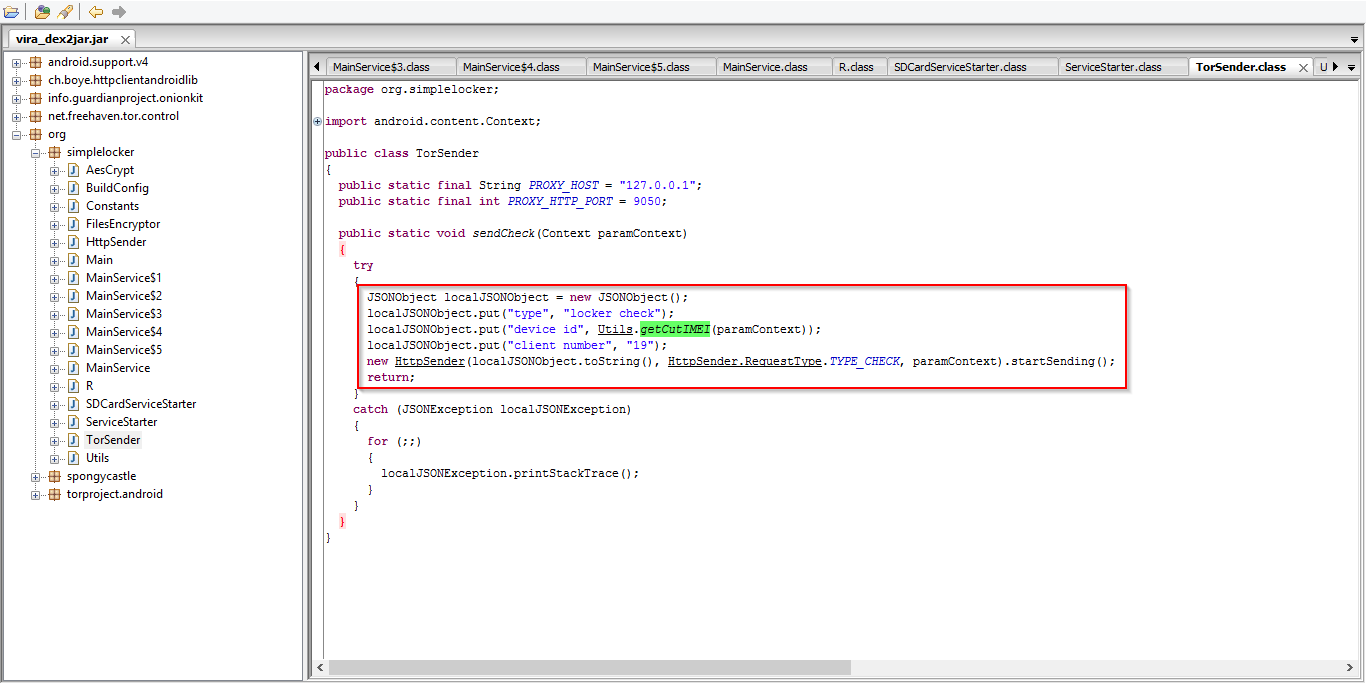 After harvesting device’s details, it communicates with the CnC server, highlighted in screen shot. Interestingly ransomware uses ‘tor’ as a proxy to connect to CnC server for silent communication.