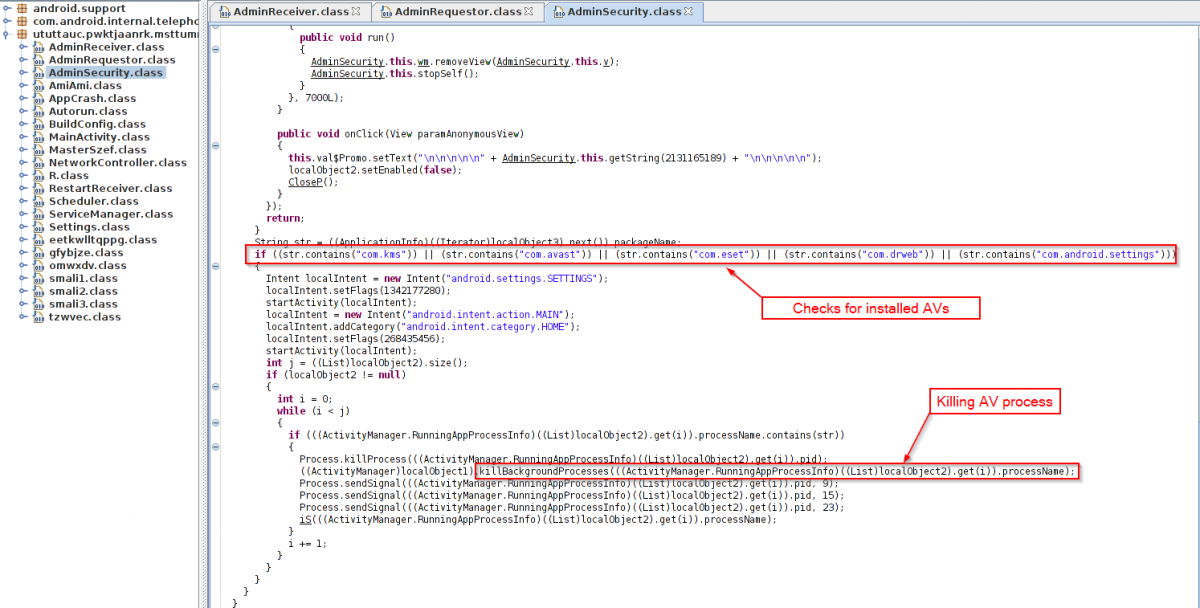 This malware payload is capable of checking for installed security applications and terminating them. We saw hard coded checks for antivirus applications like Kaspersky, ESET, Avast and Dr. Web as seen below.