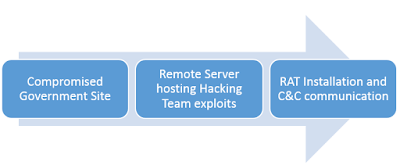 In the attack against a Pharmaceutical firm, we observed the use of a compromised Government site to redirect the victim to a server hosting the Hacking Team’s 0-day Flash exploit. This technique is known as Strategic Web Compromise (SWC) or a Watering Hole attack, wherein a legitimate trusted website known to be visited by the target group is compromised in order to redirect them to the attacker controlled server. The attacker controlled server will serve and execute browser based exploits to install a RAT on the target machine.