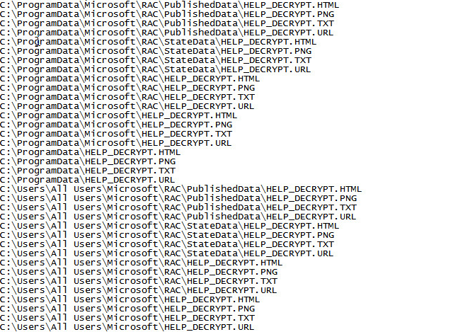 The downloaded file deletes the original copy of itself and begins encrypting all the victim's files using an asymmetric encryption method.  For each file it encrypts, it leaves behind a HELP_DECRYPT.[PNG|HTML|TXT|URL] file to instruct the victim on how to recover their files.