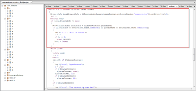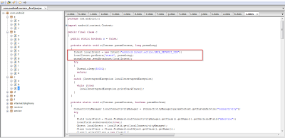 The application installs itself silently. Once installed, no icon is observed for this app. Also shown in the previous screenshot is the fact that the application waits for the screen and keyguard events before triggering its malicious activity. It does all of the activity without user intervention. This allows the malware to function without a suspicious icon on the home screen that just one of technique used by malware authors to evade its presence to the device owner.