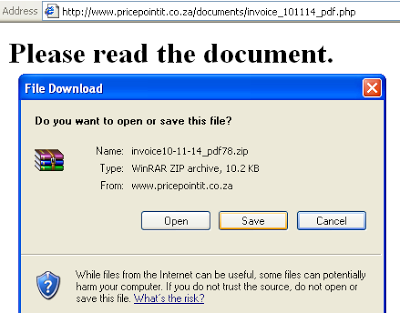 The user will then be prompted to download a zipped archive file, which contains a new variant of the Upatre Trojan downloader as seen below: