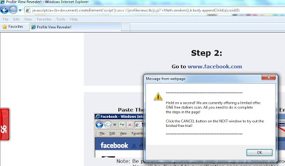 Remember, this is fake message and each time it is accessed, it simply generates a random number– this has nothing to do with actual users viewing your profile (something that Facebook does not share). The page also suggests that the user must copy and paste JavaScript into the address bar, which will of course execute the JavaScript in the context of the victim. This is similar to the earlier scam. Once the user runs that malicious code, they are presented with some fake messages requiring that they undertake surveys or view additional messages: Here are the screenshots: