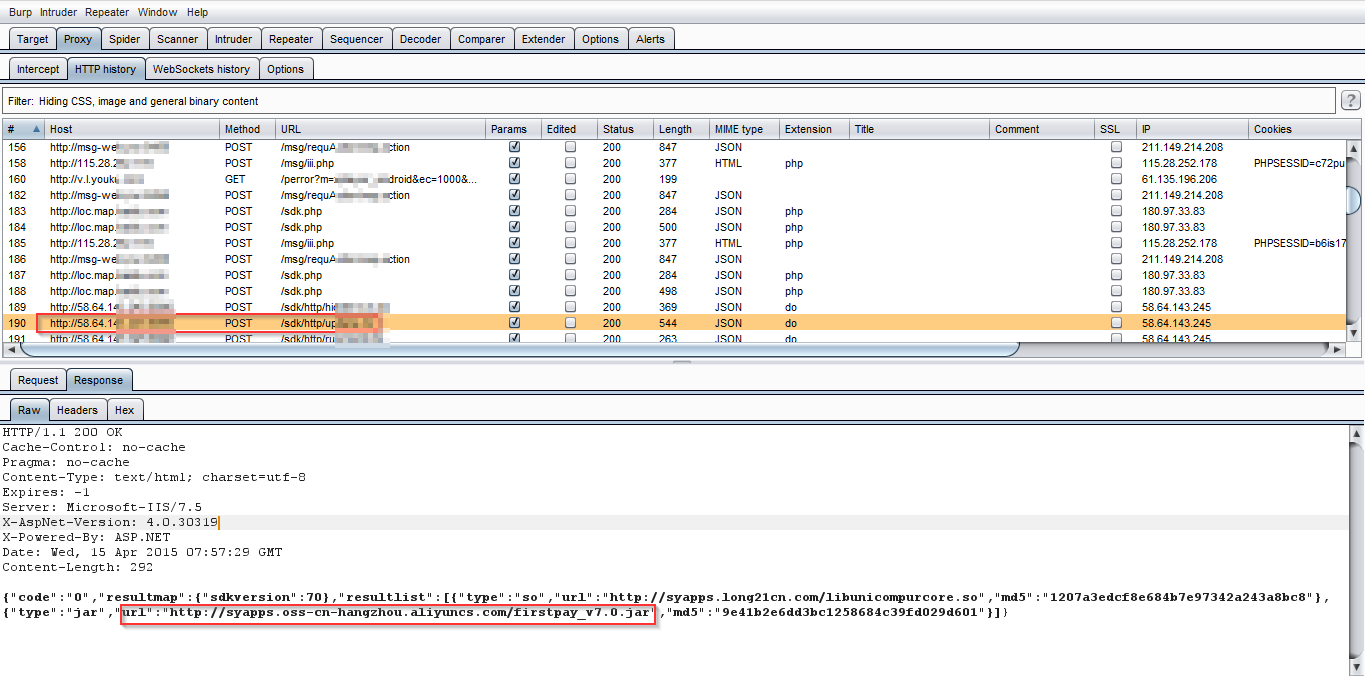 The malicious app then sends a POST request checking for updates and in response, receives a URL pointing to a JAR file named "firstpay_v7.0.jar" as seen below:
