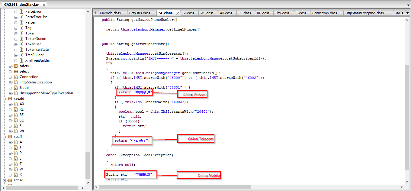 The malware also leverages the International Mobile Subscriber Identity (IMSI) property for determining the location of the device, as well as service provider information as seen below: