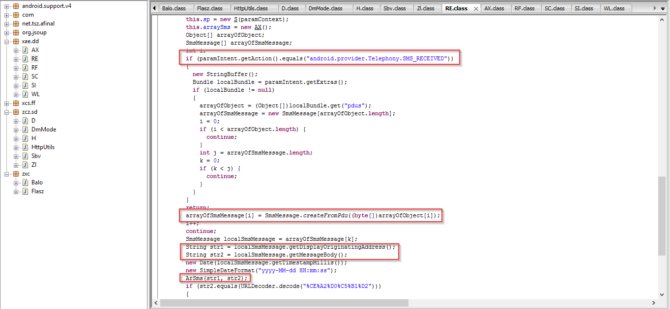 The malware then declares a Broadcast Receiver, which is registered to intercept all future SMS messages received by the user. The received message is analyzed by the malware to determine where it was received from. Once the sender's identity is confirmed, it parses the content of the received messages and matches it against certain hardcoded message strings as seen below: