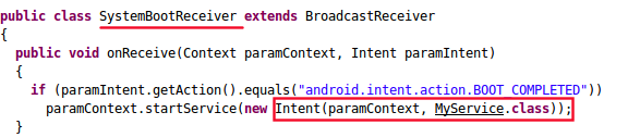 Its main task is to make sure MyService is up and running. At every reboot, it starts MyService as seen below: