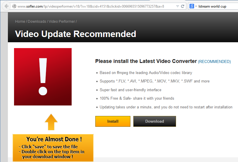 When we start the video stream, it redirects to hxxp://www.sofler.com/lp/videoperformer/v18/?v=18&cid=4151&clickid=0066965515096773257&a=8, asking for the installation of the ‘Latest Video Converter’. The page looks similar to Adobe’s Flash update website and tricks the user into downloading an updater executable. In our excitement to watch the match, we may sometimes just follow the links and install the update/software before even verifying the source.