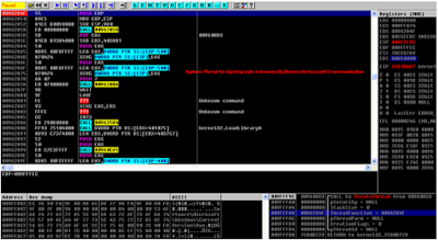 The Explorer thread searches for browser process either by checking path of the browser executable or by loaded application specific DLL (e.g. NSS3.dll for firefox.exe). If the targeted browser process is found, then the secondary thread is created in the process.
