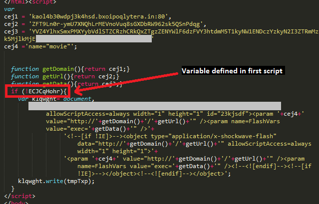 The third script code snippet drew our attention, as it is not obfuscated and simply loads an SWF object. This script serves the Adobe Flash 0-day and it is interesting to note that the script will only execute if the earlier script has thrown an error. The flash payload is only triggered if a variable defined in the first script is undefined: