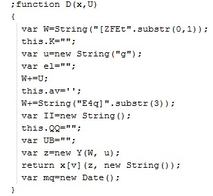 As you can see, the code still appears heavily obfuscated with numerous variables defined. You will also notice some JavaScript functions like “.substr”, “document.body.appendChild” which are commonly found in malicious code. Many of the variables defined receive a return value from function “D()” such as: