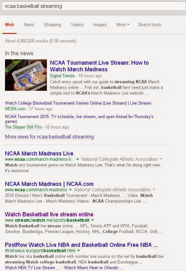 March Madness is officially upon us, with the last games of the round of 64 taking place today. As is usual with events that have such a level of interest, bad actors across the internet will be trying to get their cut of the action through topical spam advertising and phishing as well as search engine poisoning to draw ad revenue and in some cases, deliver malicious software. Though it is still early in the cycle of March Madness interest, we have seen a bit of everything: malware purporting to be NCAA bracket templates, a rash of ad-filled sites running March Madness related SEO campaigns, and the usual complement of shady streaming sites promising live streams of the tournament games (with some delivering a nasty surprise).