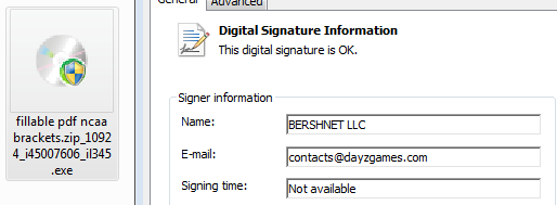 While reviewing some of the tournament-related security blocks, we spotted an interesting file download attempt. It's not clear if the original click was derived from a search, but the primary link purports to be a zipped PDF file that can be used to create personalized brackets. The link ultimately directs to an unwanted EXE signed by the Ukranian publisher BERSHNET LLC (whose history is well documented on HerdProtect).
