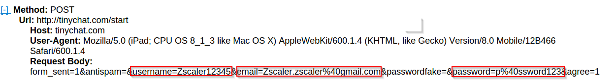 Below is the sample capture of a Tinychat user login attempt. As seen in the request, the username & password information is sent in clear text.