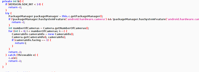 The ransomware checks whether front camera is available or not. If available, it clicks photo of the victim while he/she is using the app and displays the image on ransom page.