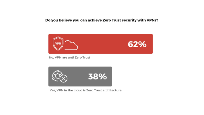 Parallèlement, ou en raison des problèmes de sécurité liés aux VPN, les entreprises affichent un fort consensus autour de l’adoption de stratégies Zero Trust pour une connectivité sécurisée. Concrètement, 62 % des entreprises considèrent que la technologie VPN est incompatible avec les stratégies Zero Trust.
