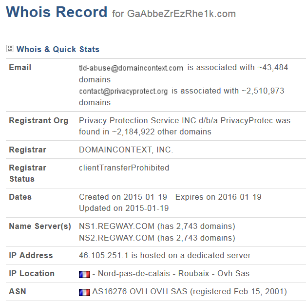 gaabbezrezrhe1k.com46.105.251.1POST /domaincontext2015-01-19contact @privacyprotect.orgns1.regway.com, ns2.regway.com
