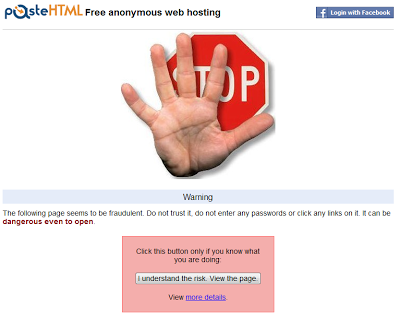 PasteHtml seems to take phishing seriously. A lot of these phishing pages were taken down, and warnings are shown for potentially dangerous pages (see hxxp://pastehtml.com/view/1b3tqp1.html).