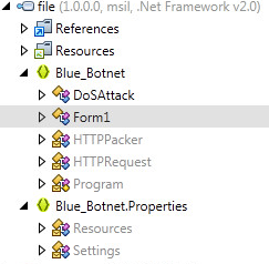 VirusTotal detection is 41/56 and indicates this is part of BlueBotnet. Looking at the binary, we see it's a .NET executable and uses no obfuscation at all to make decompilation difficult. Looking at the namespace and classes confirms this is called 'Blue_Botnet' and appears to be a DoS tool.