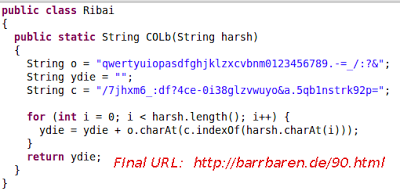 The jar applet gets the obfuscated URL from the parameter "name", which is passed by the jnlp as shown above. It is then decoded into the final URL through the following code: