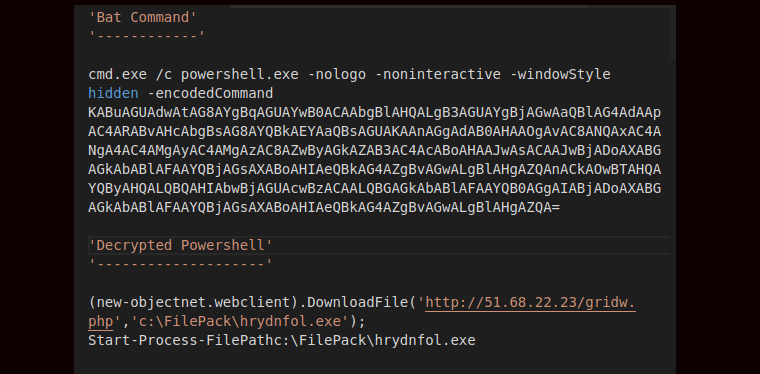 - In other cases, it drops a BAT file containing PowerShell code to download payload