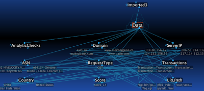 • Transaction data has related jump links to ServerIP, Domain, URLPath, RequestType, Country, ASN, Score, and AnalyticCheck and vice versa