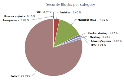 One of the question I often get asked is "What is the most prevalent threat on the Internet for the enterprises?". In terms of the total number of transactions, botnets are the biggest security risk. Once a host gets infected, the botnet usually spreads quickly within an enterprise. It also generates a significant amount of traffic to the command and control server, to download additional malware or perform other actions. For the last 30 days, botnets account for almost 80% of the security blocks at Zscaler.