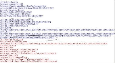 This executable downloads additional malware by visiting “hxxp://www.ffxiname.com”. Then it will add some registry values and run library “C:\DOCUME~1\ADMINI~1\LOCALS~1\Temp\300056251037don.dll,Set1” using "C:\WINNT\System32\rundll32.exe”. The TEMP directory will be full of additional malicious executables and DLL’s. The website in question (“ffxiname.com”) appears to be a drop zone, containing numerous additional exploits. The site will deliver different exploits based on the browser issuing the request. Here are some wireshark packet captures from the website: