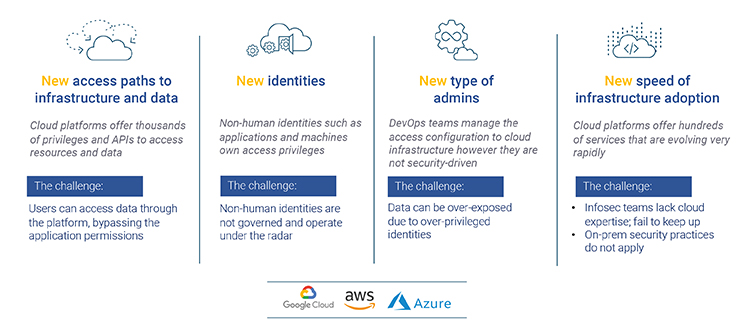2. New identities – In the data center world, you only need to worry about human identities. This is not the case in the public cloud, where human identities are typically outnumbered by non-human identities. These include applications and resources that have their own access privileges, which can be misused and/or compromised. These non-human identities are usually not governed and are often overlooked.