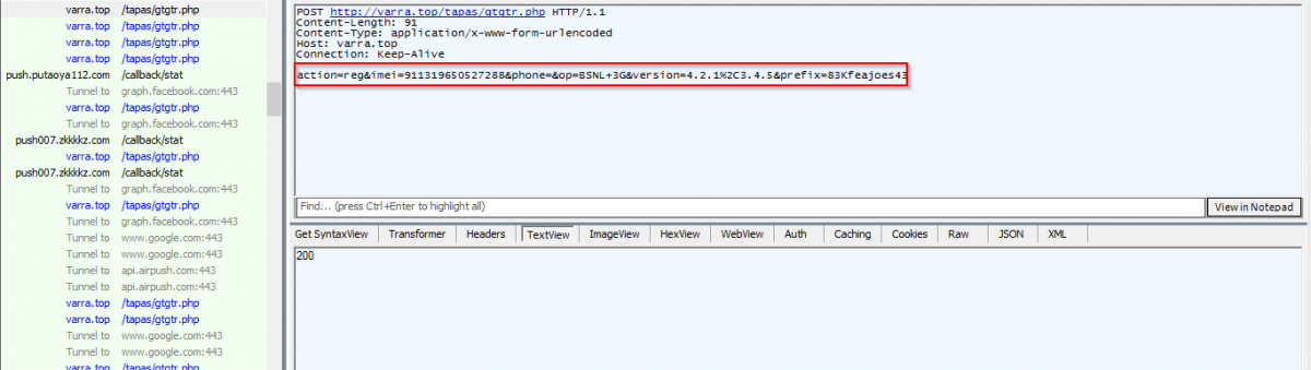 Once installed, the malware registers the device with the C&C server. Observe following code and network capture showing the registration of infected device.