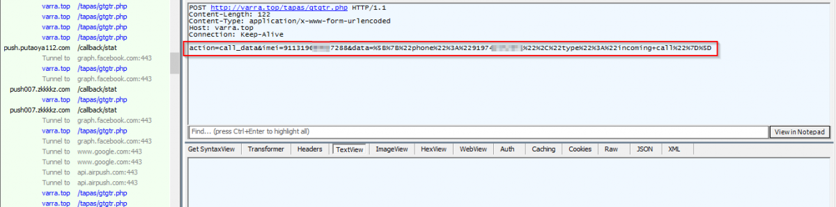 Once registration is completed, the malware monitors SMS and call operations done on the infected device. In the following image, you can see the malware harvesting call logs and sending it to C&C server. It watches all the incoming, outgoing and missed calls.