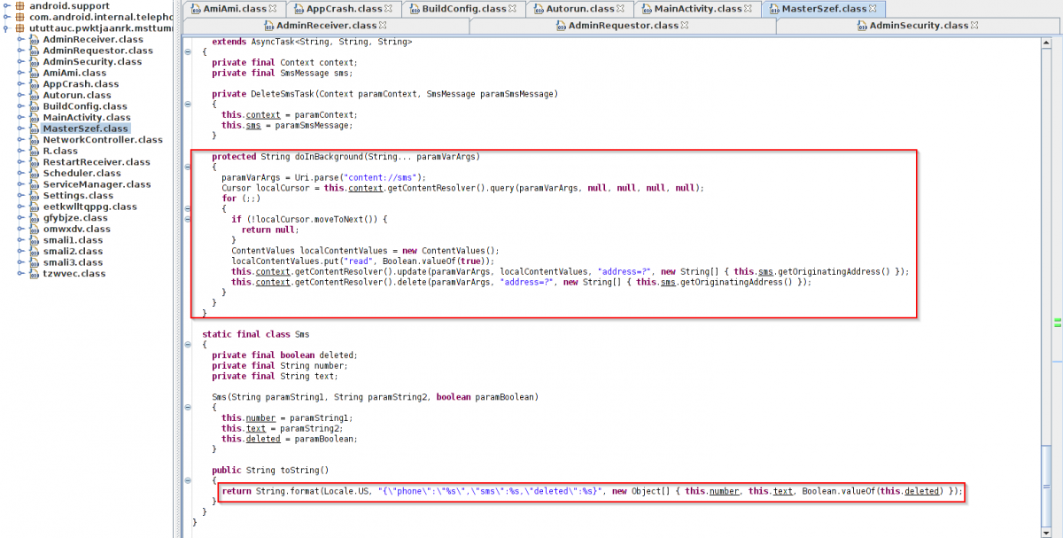 The following screen shot shows the malware stealing SMS and sending to the C&C server.