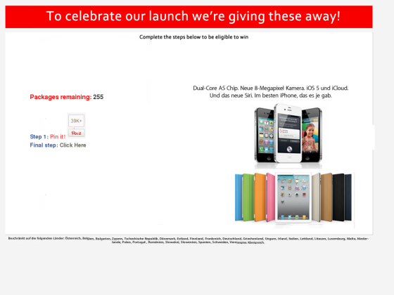 The scam is very similar to some previous Facebook spam campaigns: users have to click on the "Pin it" widget in order to receive a free iPhone or iPad. On these two sites, scammers have used a fake "Pin it" widget rather than the