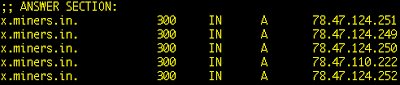 Further analysis of this particular sample shows that it makes its calls out to the domain: x.miners.in which does correspond to the previously mentioned IP in the ThreatExpert report. A round-robin has been setup as follows to handle receipt of the Bitcoins: